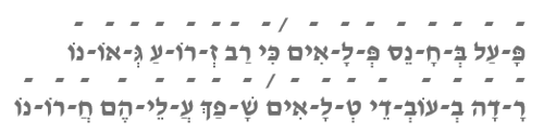 משקל הברתי־פונטי [=משקל המבוסס על מניית שוואים נעים וחטפים במניין ההברות, כתנועות לכל דבר. רווח מאוד בשירה העברית בארצות המזרח במאות השנים האחרונות]. בכל צלע 8 הברות. כך: