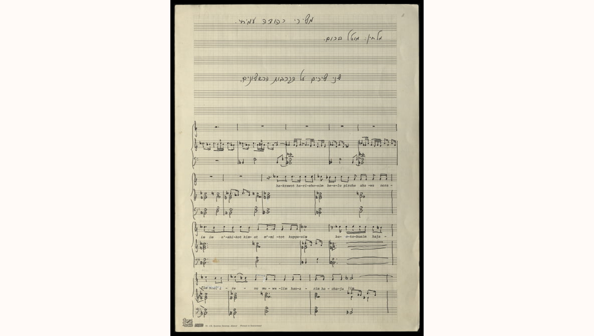 The sheet-music collection of the Jewish-Dutch composer Mottel (Mordechai) Brom (b. Lucerne, 1919; resided in Amersfoort, Holland; immigrated to Israel in 1984; d. Jerusalem, 1997) included compositions for an orchestra and chamber ensembles, liturgical music, and songs for family events. Found among the items in this collection were musical settings of poems by four renowned 20th-century Jewish poets: Mascha Kaleko (German), Primo Levi (Italian), Leah Goldberg and Yehuda Amichai (Hebrew). The lyrics, inserted by typewriter interlinear with the score, are in Latin characters, according to Dutch pronunciation.