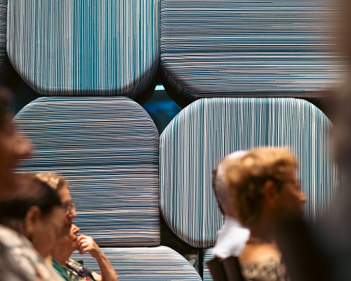 גלי כנעני, אומנית טקסטיל בכירה, עיצבה לבקשתנו קיר ארוג מבד לבניין החדש שלנו. החומר בו השתמשה הוא בד ג'קארד שכ-40% ממנו עשוי פוליאסטר ממוחזר. זוהי יצירת הטקסטיל הארוכה ביותר בישראל, והיא משתרעת על כ-105 מטרים: 51 מטרים מתוכם על קיר בית הקפה, ועוד 54 מטרים על קירות מרכז החינוך של הספרייה הלאומית.